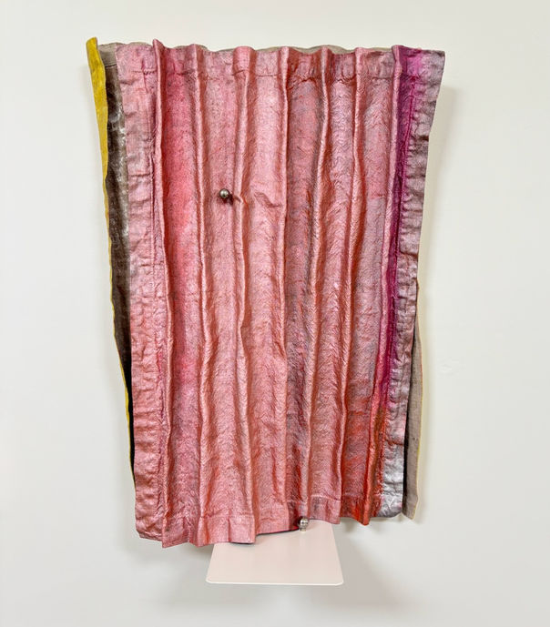 The paintings are largely monochromatic, with subtle tonal shifts and metallic sheens that respond to light, emphasising the folds as expressive sites of compression and release. In this way, the works operate as intimate, provisional monochromes—somewhere between painting, object and fragment. The series is conceptually linked to the envelope poems of Emily Dickinson, where thought is condensed into folded, everyday materials. Like Dickinson’s fragments, these works privilege intimacy, restraint and material presence, allowing meaning to emerge slowly through touch, light and proximity.